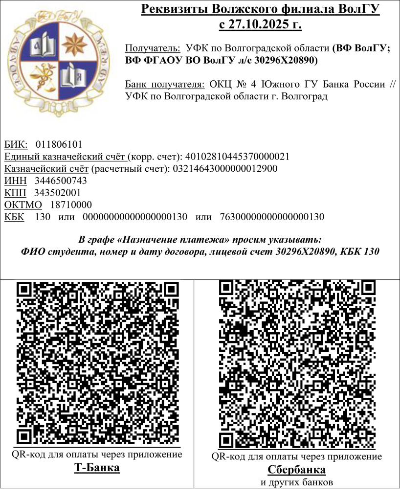 Получатель: УФК по Волгоградской области (ВФ ВолГУ; ВФ ФГАОУ ВО ВолГУ л/с 30296Х20890) ИНН 3446500743 КПП 343502001 Банк получателя: ОТДЕЛЕНИЕ ВОЛГОГРАД БАНКА РОССИИ//УФК по Волгоградской области г. Волгоград БИК 011806101